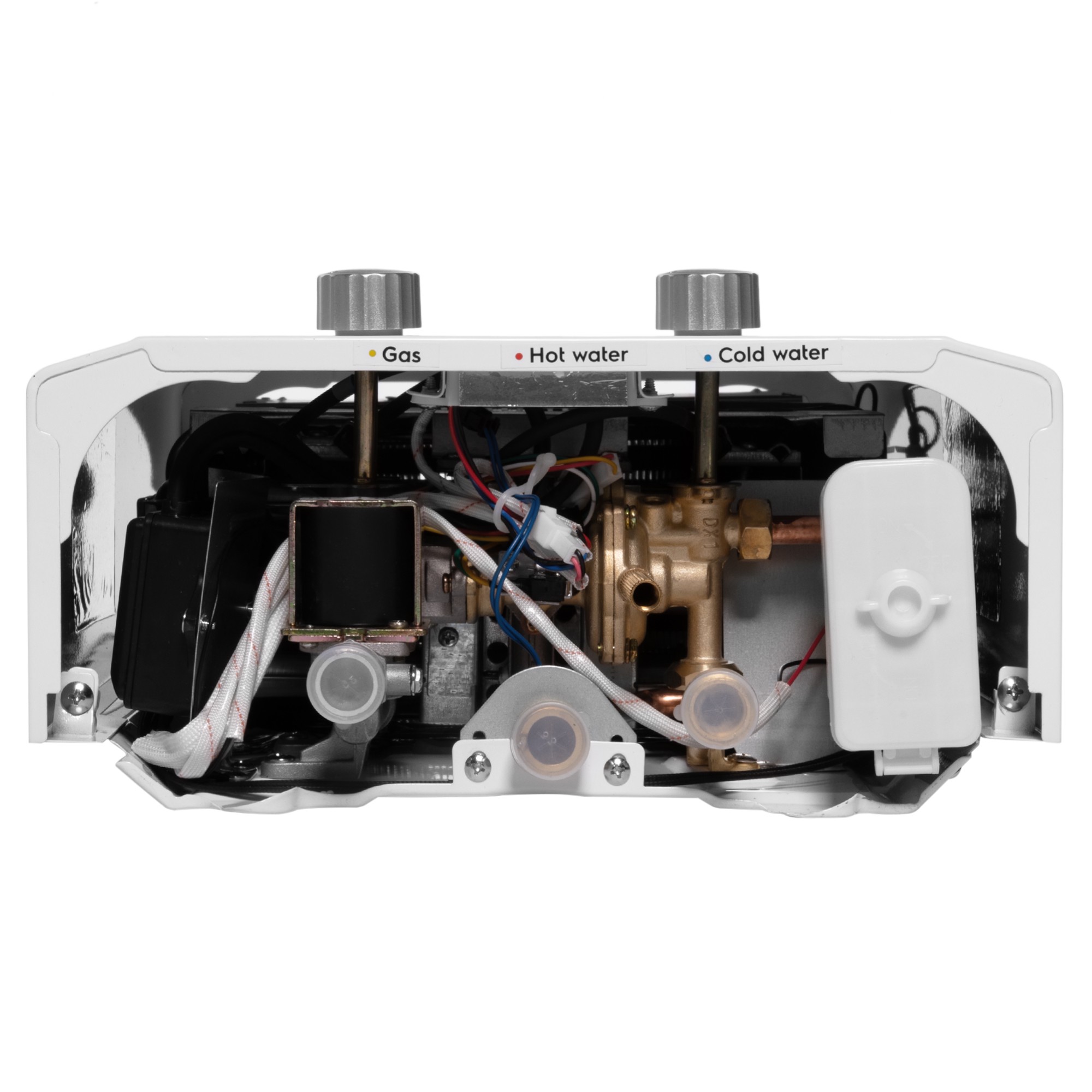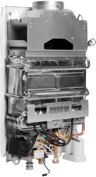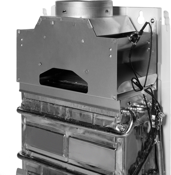 Для безопасной работы водонагревателя предусмотрена четырехуровневая система контроля, включающая в себя датчик тяги, защитный термостат, гидравлический предохранительный клапан и контроль ионизации пламени. Все вместе это обеспечивают надежную и безопасную работу колонки. Для защиты лицевой панели от перегрева и прогорания прибор дополнительно оснащен металлической пластиной.
