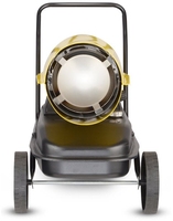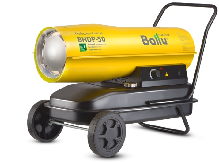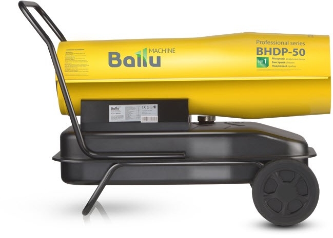 Воздухонагреватель дизельный прямого нагрева Ballu BHDP-50 серии Tundra предназначен для обогрева нежилых помещений и локального прогрева рабочих поверхностей. Тепловая мощность прибора составляет 50кВт. При работе дизельной пушки воздушный поток, проходя через защитную решётку – втягивается в камеру сгорания. Там он смешивается с распылённым форсункой дизельным топливом, которое при помощи мощного насоса под высоким давлением подаётся из топливного бака, образуя воздушно – топливную смесь. При помощи 12kV электродов смесь поджигается и сгорает, а затем - выбрасывается наружу, смешиваясь с продуктами сгорания и с основной массой поступаемого воздуха, тем самым нагревая его. Теплоотражающий экран, расположенный в передней торцевой части корпуса прибора- служит препятствием для вырывающегося открытого пламени и обеспечивает равномерный прогрев помещения либо обогреваемой рабочей поверхности.