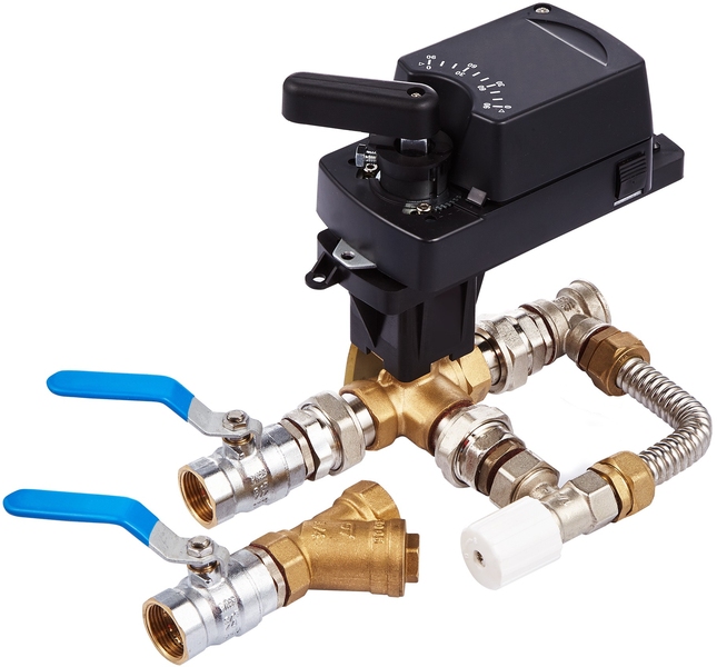 Смесительный узел для подключения воздушных завес с водяным теплообменником к системе отопления. Благодаря встроенному электромагнитному клапану узел в автоматическом режиме контролирует проток теплоносителя через теплообменник завесы тем самым регулирует ее тепловую мощность и температуру помещения.
